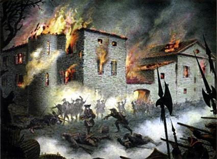 Le brûlement des Cévennes. Plaque de verre peinte, Samuel Bastide, 1926.